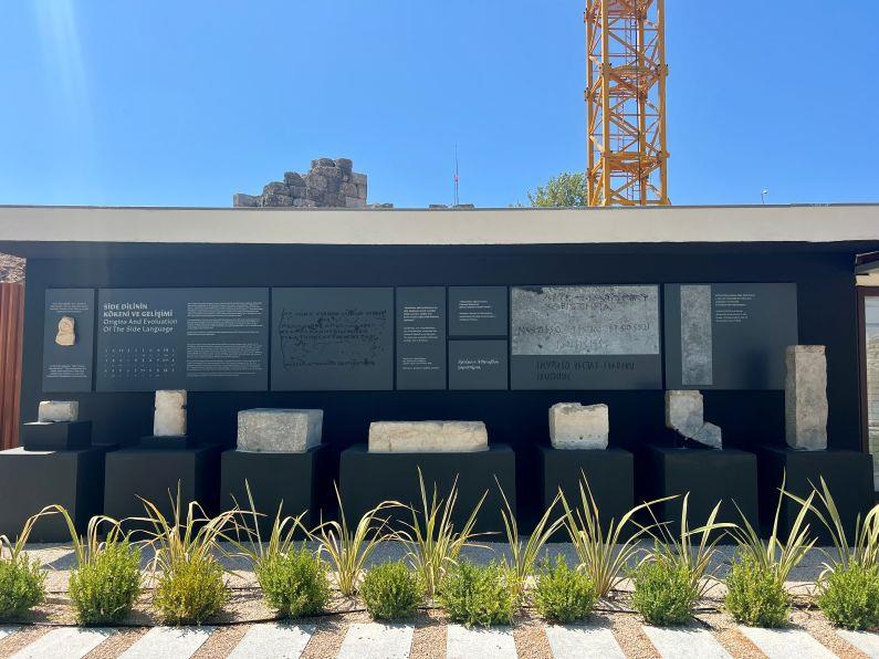 Açık hava sergi alanı olan bahçede, palaestra (avlu) ve ikinci tepidarium bölümünde; mezar stelleri, lahitler, sunaklar, Nike heykelleri, oyun masaları, sütun başlıkları, işlikler, arşitrav ve friz blokları, mil taşları ve diğer mimari parçalar yer alıyor. Ayrıca, Side’nin kendine özgü yazı diliyle yazılmış Sidece yazıtlar ile M.Ö. 8. yüzyıla tarihlenen bazalt krater gibi nadir eserler özel bir bölümde sergileniyor.